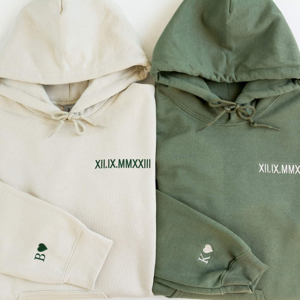 Custom embroidered roman numeral hoodie with sleeve initial. These make the perfect gift for anniversaries, engagements, new relationships, bachelorette or bachelor parties, or for any special occasion.